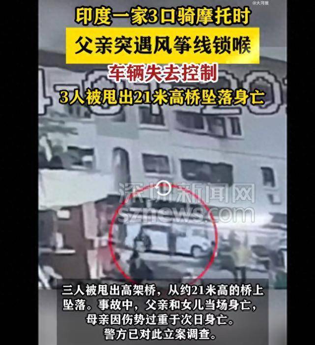 1月14日,印度苏拉特一家三口骑摩托车经过高架桥时,父亲遭风筝线锁喉致3人从桥上坠亡。报道称,风筝线突然缠到父亲的脖子上,他试图拉线时失去对车的控制,撞上隔离带。三人被甩出高架桥,从约21米高的桥上坠落。事故中,父亲和女儿当场身亡,母亲因伤势过重于次日身亡。警方已对此立案调查。